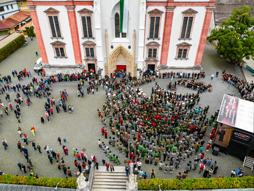 Die Vielfalt von Blasmusik und Volkskultur war auch im Festprogramm zu spüren: Platzkonzerte am Mariazeller Hauptplatz zum Auftakt am Samstagnachmittag: Chöre, Blasmusikkapellen und Tanzgruppen aus allen Teilen der Steiermark boten hier ab 13 Uhr ihr Können dar. Der anschließende sternförmige Einmarsch der Blasmusikkapellen aus drei Richtungen zum Vorplatz der Basilika bot Augen und Ohren einen besonderen Genuss, der in einem gemeinsamen Großkonzert aller Mitwirkenden im wunderbaren Ambiente vor der Basilika gipfelte.